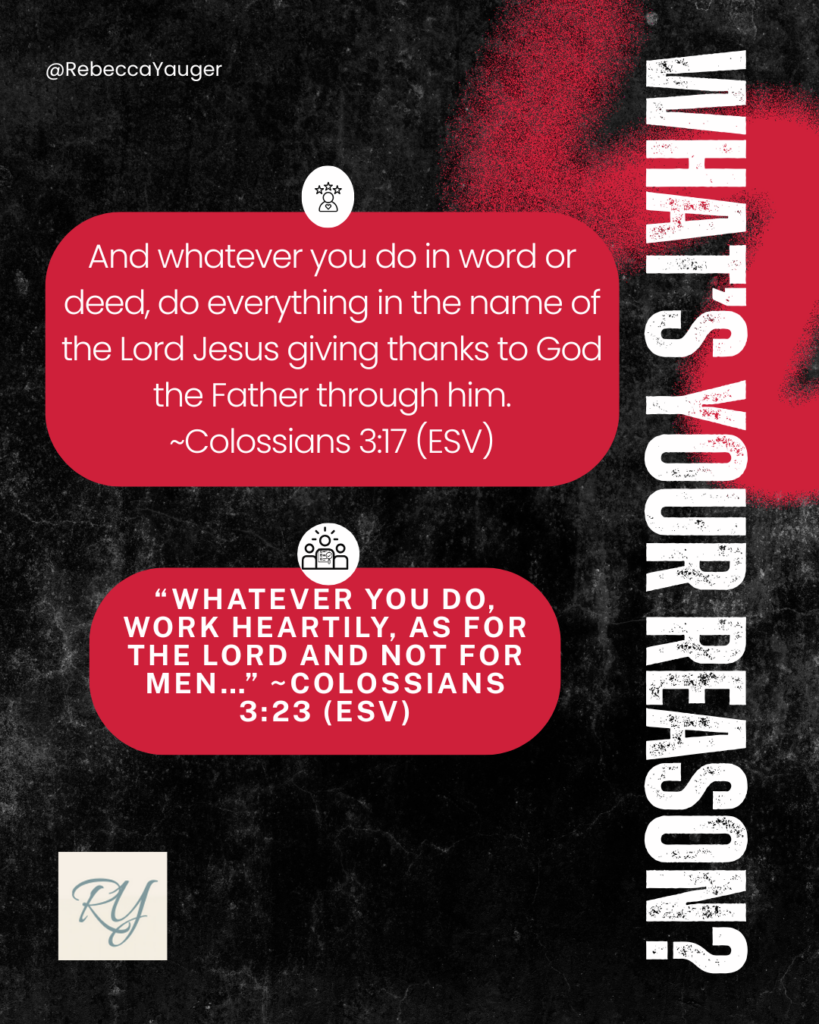 It says later on in chapter 3 of Colossians, verse 23, “Whatever you do, work heartily, as for the Lord and not for men…” (ESV). That familiar verse now reads a bit differently when I couple it with motivation and finding my reason for doing what I’m doing.
